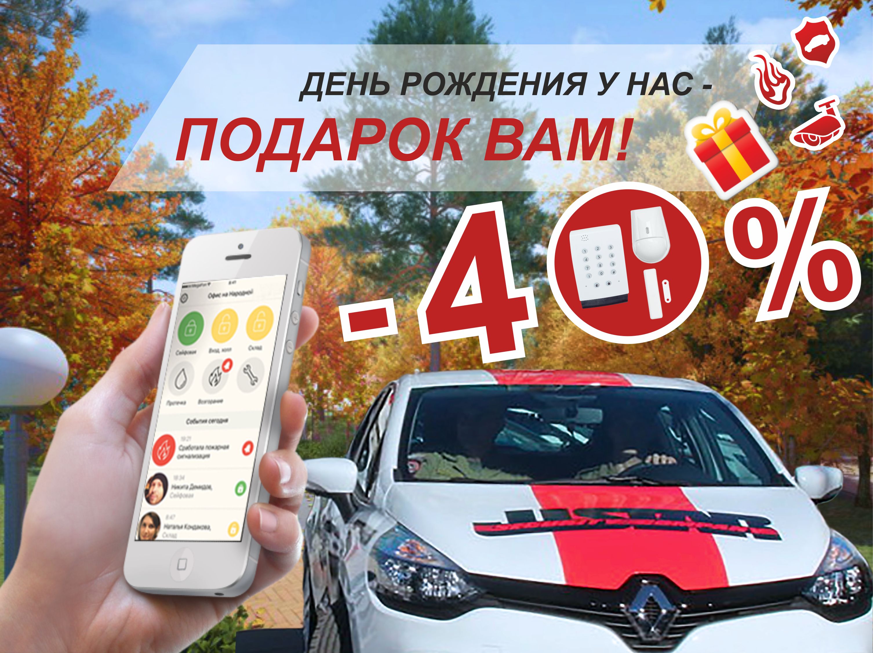 Ко Дню Своего Рождения мы дарим клиентам, подключающим на пульт Justar свои квартиры и дома, 40% стоимости базового комплекта охранного оборудования.